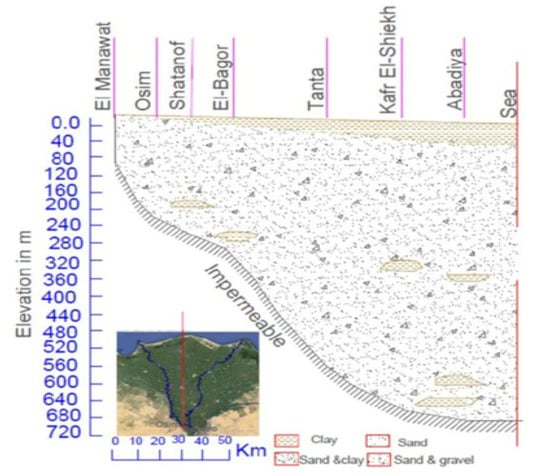 The geology of this study area is formed from two layers: the upper layer known as the Bilqas formation was laid down in the Holocene age and is made up of alternating fine to medium-grained sand, silt, and clay interbeds, and the lower layer which functions as a semi-confining layer for the aquifer is the Mit-Ghamr formation, which includes organic matter and peat beds [26]. The Nile Delta Quaternary aquifer is classified as a semi-confined aquifer [27,28]. Figure 3 presents a vertical section through the formation of aquifer systems in the Nile Delta area, with gradient thickness ranging between more than 800 m in the north and 200 m in Cairo, where the RBF site is located [29]. The depth of groundwater is 2 m in the north, gradually increasing to 5 m in the south [30].