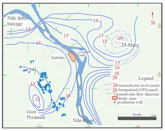 The geomorphologic features of the study area consist of Al-Warraq island to the east and the surrounding western branch of the river Nile. The average land levels range between 17 to 20 m above mean sea level (masl) reaching 23 m at the western boundary, while the eastern boundary is the river Nile branch with average bed level 8.8 (masl) and width 250 m. The groundwater reservoir in the study area depends on the river Nile at the source of the delta barrages, and its flow is generally in a northerly direction. However, due to the presence of two side depressions, at the Giza pyramids to the west and the Marg to the east, and due to the high levels of groundwater extraction at the-Remayyah Golf Club and the Giza Pyramids site [23], the flow conditions in the southern part of the map are different on the left from those on the right side of the river.