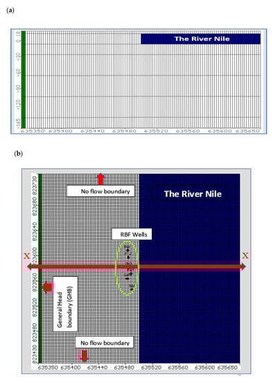 The boundary conditions for the NDA were assigned using a river package where the river Nile was assigned at the east side with stage starts from 16.17 to 16.15 (masl) at the south side. The northern and southern boundaries had no-flow boundaries. However, along the model’s western boundary a general head boundary (GHB, Cauchy BC) representing the unaffected groundwater head was set, starting from 16.18 to 16.20 (masl) at a distance of 150 m from the river Nile, where the natural groundwater slope was assigned 0.083‰ [25]; these values were based on the groundwater map published by [23]. Figure 5a,b show the study area boundary conditions. The aquifer hydraulic parameters including hydraulic conductivity [K] ranged from 0.25 to 5 m per day [m/day] for the clay cap and the fine sand top layer, while the course of coarse Quaternary sand ranged from 10 to 60 m/day. The storage coefficient [S] for the upper layers was 10−3–5 × 10−3 and 2.5 × 10−3 for the lower layers, the specific storage [Ss] ranged from 0.1 to 0.2, and effective porosity from 40% to 25% [Table 1]. The total abstraction from the study area reached 50,000 cubic meters per day (m3/day), while the average net recharge was 0.5 mm/day [40]. A constant concentration of 260 ppm was assigned along the river boundary, and initial concentration was set at 1000 ppm [41]. These parameters are reported by [42,43].