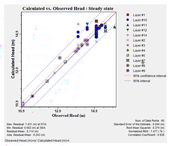 The model calibration started with a comparison of the simulated head with the measured data from the observation wells using the piezometric contour map of Greater Cairo developed by [23] (see Figure 4). The flow model was calibrated for steady-state by changing the aquifer hydraulic conductivity using a trial-and-error approach to match the model results and piezometric head. Figure 6 shows the difference between the calculated and observed heads, where the root mean square [RMS] and normalization root mean square reached 0.366 m and 8.135%, respectively; the correlation coefficient also reached 94%.