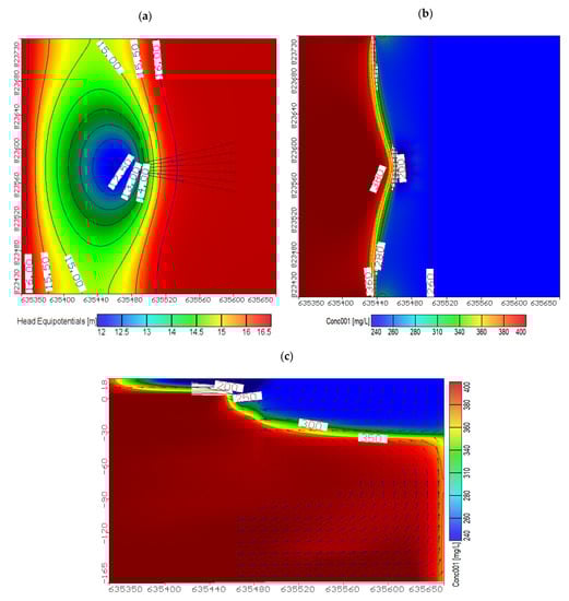 Model calibration results for base case; (a) Aerial view of head and path line, (b) Aerial view of total dissolved solids (TDS) contamination, and (c) Vertical cross section for distribution of TDS