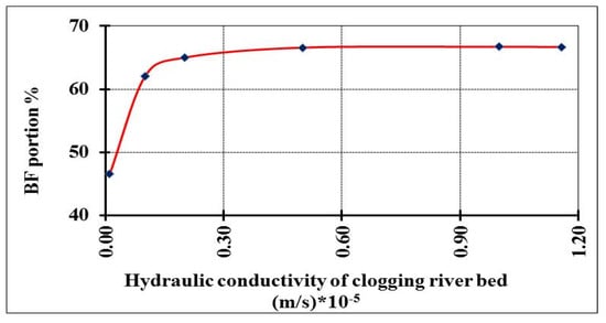 The solute transport model was calibrated by changing the hydraulic conductivity of the clogging bed layer (kclogging) on the RBF portion by 0.01 × 10−5, 0.1 × 10−5, 0.2 × 10−5, 0.5 × 10−5, 1 × 10−5 and 1.16 × 10−5 m/s. Figure 8 shows that the relationship between kclogging and RBF share reached 46.54%, 62.07%, 65%, 66.59%, 66.71% and 66.88%. The model results give a good match with the field measurements and the numerical investigation by [20,25,37], where the RBF portion at Embaba, Nile Delta, Egypt is around 60%, which corresponds to kclogging of 0.5 × 10−5 m/s (0.43 m/day).