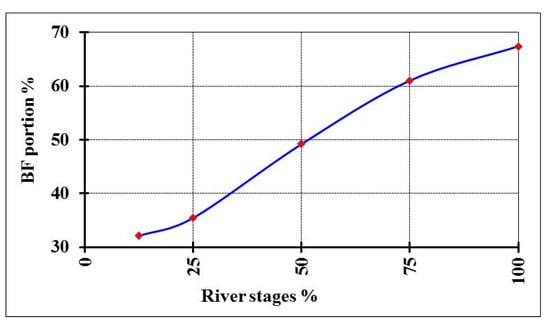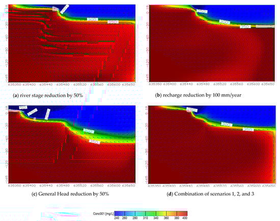 Four scenarios were enacted to estimate the RBF efficiency for decreasing the river stage to reach 75%, 50%, 25%, and 12.5% from the base case, where the river boundary was changed to start from 14.70, 13.23, 11.17, 9.77 m and end at 14.68, 13.21, 11.15 and 9.75 m, respectively. The RBF portion reached 61.05%, 49.20%, 35.46%, and 32.11%, respectively, compared with 67.42% for the base case (see Table 2). Figure 9 shows the relationship between the different river stages with the percentage of RBF portion, whereby the results indicate that this system has high sensitivity to the river stage. Moreover, Figure 13a presents the vertical distribution of TDS in the study area for a 50% reduction in river stage. The expected impacts of climate change on the RBF system in this scenario are shown in Table 2, where the travel time reached 220, 280, 800 and 1000 days, respectively. The results show a corresponding decrease in the RBF portion and increase in travel time as the river stage drops due to climatic changes, so the RBF system requires high heads for increasing the system portion and sustainability.