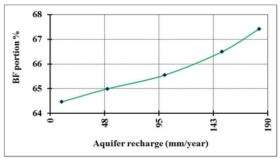 Figure 10 shows the results of numerical simulation changing the aquifer recharge based on the expected scenarios of climate change for the charge by 182.5, 150, 100, 50, and 10 mm per year. The results of the RBF portion reached 67.42%, 66.50%, 65.55%, 64.99%, and 64.47%, respectively, while the travel time reached 200 days for all scenarios (see Table 2). Moreover, the TDS distribution for a reduction in aquifer recharge to value 100 mm per year is presented in Figure 13b. The results also show that low values of rainfall in arid and semi-arid regions have an effect on RBF portion, but no effect on particle travel time.