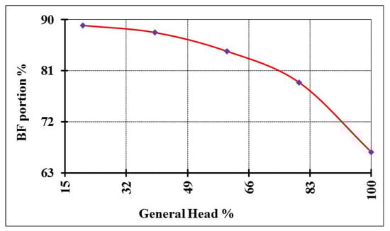 The General Head Boundary [GHB, Cauchy BC] was studied as a product of decreasing groundwater levels due to increased groundwater abstraction as a result of overpopulation. The current scenarios involved reduction of groundwater levels to reach 80%, 60%, 40%, and 20% from the base case. The GHB changed, starting at 12.90, 9.68, 6.45, and 3.22 (masl) and ending at 12.15, 8.10, 4.05, and 2.03 (masl). The simulation results show that decreasing the GHB led to increased RBF portion due to changing groundwater flow direction from the high level at the riverside to the low level at GHB. Moreover, Figure 11 and Table 2 show the RBF portion reaching 78.94%, 84.43%, 87.75%, and 89%, while the travel time reached 140, 95, 80, and 70 days. Moreover, the results of TDS distribution at 50% reduction in GHB are shown in Figure 13c. These results confirm that decreasing groundwater heads led to an increase in RBF portion and a decrease in travel time due to an increased slope of groundwater heads from the river to land-side.