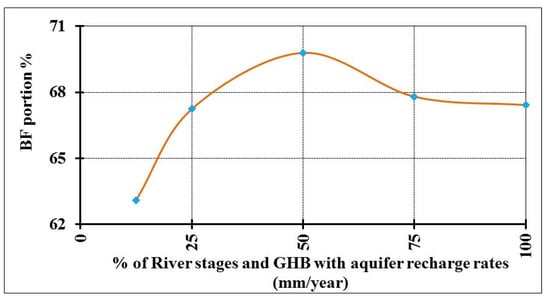 This part of the study was carried out using a combination of a reduction in river stage with groundwater recharge and with general head as a result of climatic changes in arid and semi-arid regions. The river stage and the GHB boundary were reduced to 75%, 50%, 25%, and 12.50% from the base case, while the aquifer recharge was changed by 150, 100, 50, and 10 mm per year. The RBF portion and the travel time are presented in Figure 12 and Table 2. The results show that reduction in river stage and GHB by 75% and 50% with aquifer recharge of 150, 100 mm/yr increased the RBF portion to 67.80% and 69.79% with constant particle travel time at 220 days, whereas the RBF portion decreased to 67.24% and 63.10% and the travel time increased to 220 and 240 days with further reduction in river stage and GHB by 25% and 12.50%, and aquifer recharge by 50 and 10 mm/yr, respectively. Moreover, Figure 13d shows the distribution of TDS at 50% reduction in river stage and GHB with aquifer recharge at 100 mm/yr. These scenarios indicate that surface water and groundwater boundary conditions are more critical for using RBF in arid and semi-arid regions to decrease the negative impacts of climate change on river water quality and groundwater recharge, whereby this system is the key to improving water quality management and sustainability in these regions.