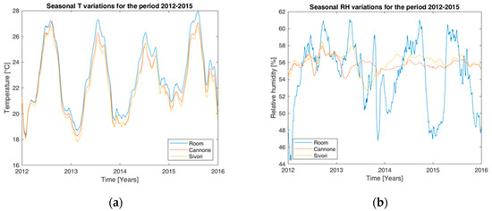 In fact, the relative humidity values of the room vary according to temperature fluctuations and seasonal changes over the months, in a range of approximately 45–60%. However, the RH values directly measured on the two violins are less variable, thanks to the display cases containing effect, especially after the installation of the control system in 2013.