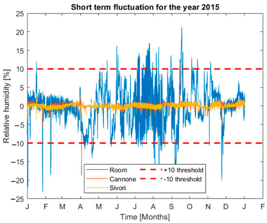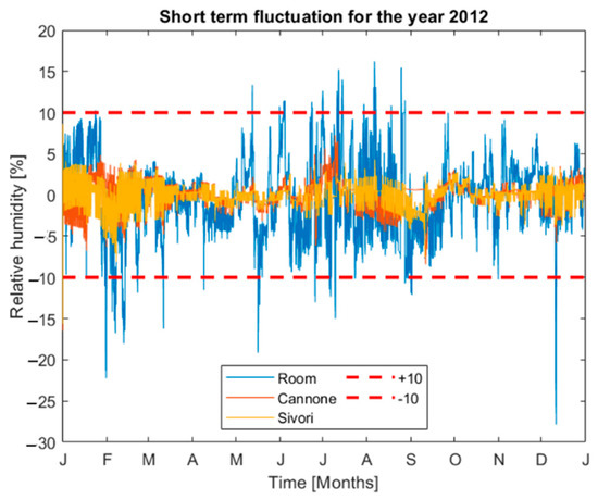 On RH data of the year 2012, before the installation of a control system, short term fluctuations were calculated as a difference between a current RH reading and a 30-day MA. Thus, it takes into account both the natural seasonal variability and the stress relaxation time constant of the materials. The parameter T is not directly considered in this analysis, if not for its influence on RH fluctuations.