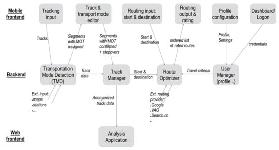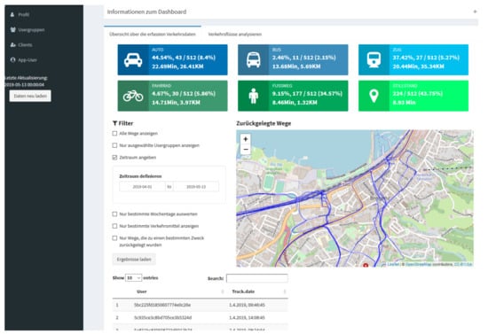 These are the issues behind the socio-political level objectives. Authorized institutions should be provided with accurate information about the real travel behavior of the population. A mobility behavior analysis application has to process and present the corresponding data in a way that helps participating (e.g., municipal) institutions to carry out customized and time-limited evaluations of traffic flows based on tracks released by participating app users. This means the respective analysis application has to provide flexible filtering and appropriate graphical output instruments. In addition, the software should be modular and extendable with regard to new filters and combinations of various data sets. This travel behavior analysis application should be easily accessible and is going to be used by traffic analysts and decision-makers on traffic infrastructure, in particular, authorized officers from civil services. Current research in the area of travel behavior analysis application is summarized in Section 3.4.