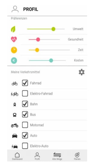 The chosen transportation criteria should be used to give the user intuitive feedback on her/his journeys and on routes for prospective trips she/he might want to travel and which she/he wants to compare concerning her/his transportation criteria settings. In addition, it is important for the usability and acceptance of our app that the settings are concise, comprehensible, and easily customizable for an average person. All this means that the number of transportation criteria has to be reduced to a minimum that covers as many relevant aspects as possible without overlap. It is sufficient if the user can weigh these central criteria relative to each other in her/his profile setup to express the personal importance of every single criterion.