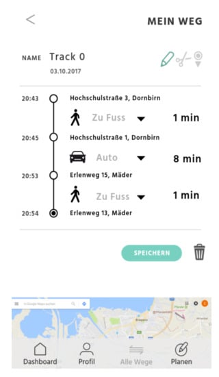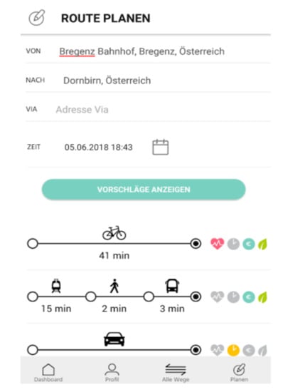 Besides recording tracks and detecting the MOT for them, it is a central requirement for the Mobility Choices system to suggest suitable routes for the user. Route planning is a wide field for research [36]. Also, multi-modal route planning has been subject to a large number of publications [37,38]. Fortunately, there are good implementations around for multi-modal route planning and there exist routing providers with a public API. There is, for example, an open-source implementation of RAPTOR [https://github.com/planarnetwork/raptor, accessed on 9 February 2021] [39] and OpenTripPlanner [http://www.opentripplanner.org/, accessed on 9 February 2021], another open-source route planner based on RAPTOR, using OpenStreetMap and General Transit Feed Specification (GTFS) [https://gtfs.org/, accessed on 9 February 2021] for specifying the public transportation schedules. So we could install one of the existing multi-modal route planning systems and configure it with the relevant public transport schedules. However, we soon found that the public transportation schedules for Vorarlberg and the German Lake Constance region are not published in a computer-readable format, so we had to look for alternatives that ideally should include a complete routing service with appropriate API. The Google Maps API [https://developers.google.com/maps/documentation/javascript/tutorial, accessed on 9 February 2021] officially supports multi-modal routing, including public transport, but its routing support for public transport in Vorarlberg is merely restricted to trains and is therefore not suitable for our purposes. However, we can still use the Google Maps API (together with MapQuest Open Directions API [https://developer.mapquest.com/documentation/directions-api/, accessed on 9 February 2021]) for planning routes via car, bicycle, or for walking. The Austrian public transportation providers have outsourced their route planning to Verkehrsauskunft Österreich (VAO) [https://verkehrsauskunft.at/, accessed on 9 February 2021], which provides a REST API to its chargeable routing service, which also covers the public transport of the city of Lindau (Germany). The Swiss public transport is completely covered by the routing provider search.ch [https://www.search.ch/, accessed on 9 February 2021] that offers a freely accessible public API. We, therefore, came up with a suitable set of routing providers that we must combine adequately so that our system finally supports cross-border multi-modal route planning while taking into account the personal preferences of the respective user, e.g., maximum distances for walking/cycling and a maximum number of transfers [40,41,42].