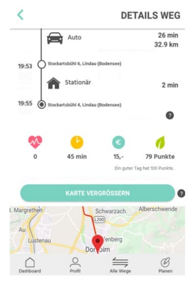 Usually, these VTBC systems record the travel data only for the purpose to suggest sustainable travel information to its users, but the data that accrues in the system anyway could be used for travel behavior analysis by authorized institutions. So if a corresponding app offers not only good persuasive strategies but also incentives for its users, it could motivate them to use the app and provide the tracking data for evaluations as an additional benefit. It is, e.g., an idea of the developers of the BikeNow [http://vkwvlprad.vkw.tu-dresden.de/, accessed on 9 February 2021] system that cyclists could be motivated to allow the further usage of their ride-related data, like current position and speed that might be of high value for traffic analysts, for prediction, and future planning of cycle paths. In return, the BikeNow app predicts the green light phases of traffic lights along the track of cyclists and provides a suggestion to keep or change the current speed [22]. VTBC systems could work similarly. MC wants to offer alternative routes for its users that better correspond to their preferences and, in return, the user gives her/his anonymized travel data for authorized evaluations to enable improved planning of the transport infrastructure.