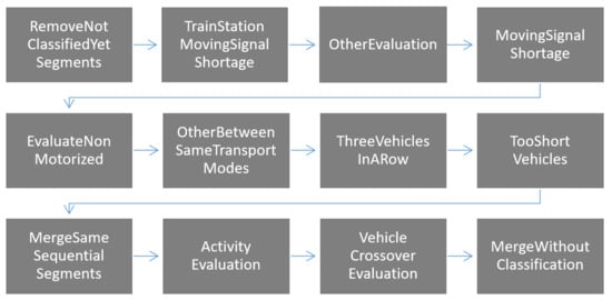 Several researchers show that the results of the classification phase can be further improved by different kinds of post-processing. Zheng et al. [34] use probability values to check the plausibility of transitions between different MOT. In a second publication, Zheng improves this solution with a graph-based approach [31]. Guvensan et al. [35], on the other hand, describes a healing algorithm that is based on the assumption that there must always be a short walk segment between each MOT change. Due to this fact, only one MOT is allowed between two walk segments.