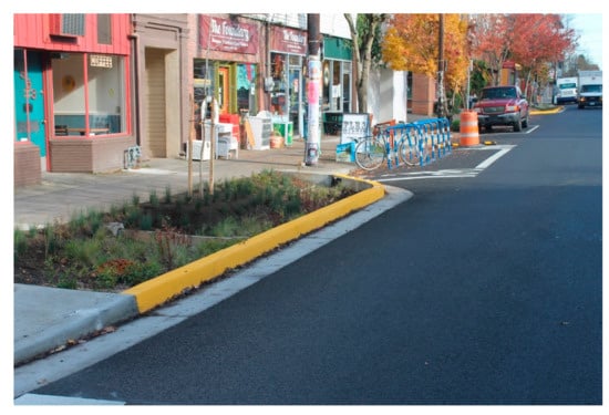 Paradoxically, the insertion of green infrastructure within the ROW, instead of harming or diminishing the movement function, might strongly benefit pedestrians and cyclists. These modes, also known as active modes, are important within the urban transportation strategy for sustainability. Evidence suggests that there is a causal effect between tree planting and cyclist satisfaction [,]. Another transportation-related benefit provided form bio-swales installed next to intersections, is that the crosswalk distances for pedestrians can be shortened, reducing risk exposure, while slowing traffic down.