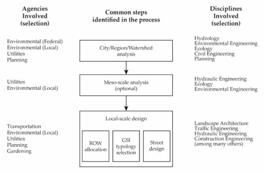 These previous processes imply complex institutional interactions, a systemic view of the problem, and multidisciplinary work. We found that the planning and design of green streets implicate various federal, regional, and local public entities, besides the DOTs, including the EPA and the local environmental, water, and utility departments. However, the local DOTs still play a paramount role in this complex process.