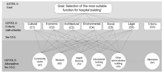 For this study, the goal is determined as “defining the most suitable alternative for reusing the hospital building” and criteria for defining the most suitable function for the historic building are determined from the literature review. Besides, the alternatives are collected from the questionnaire survey with locals. Accordingly, the phases of creating AHP started (Figure 2).