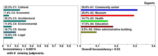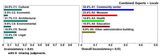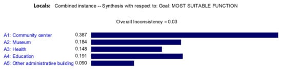The differences come to the forefront between the two groups of respondents—experts and locals—in particular when it came to defining the alternatives. During the decision-making process, the first team’s (the experts) ranking is listed as a community centre, museum, education, health, and other administrative building, while in the second team (locals) the results were community centre, education, museum, health and other administrative building. According to this ranking, for both teams, the primary choice is a community centre.