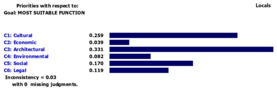 There are various scientific works presented in the literature that practice the application of MCDM methods in cultural heritage decision problems [34,49,50,51,52]. MCDM for cultural heritage can be useful for the evaluation process of historic building adaptive reuse [34,47,52,53], the planning and reconstruction of a historic building, grading historic centre and buildings [46,54], cultural heritage conservation, and for measuring the extent to which the project meets the social needs of the population.