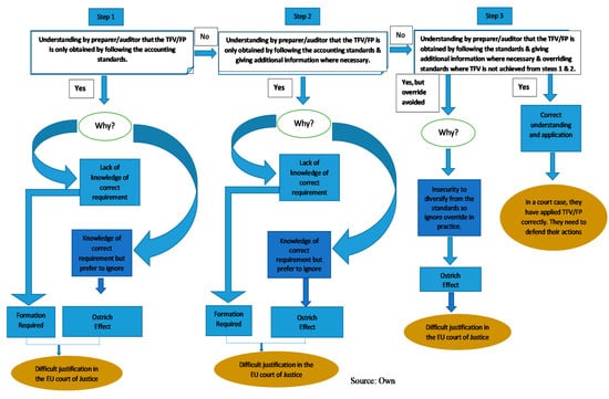 In this section, we applied the ostrich effect and comfort theory to the TFV/FP subject. Looking at the criteria included in both IFRS and the EU Directive, a step-by-step procedure is proposed. Firstly, the accounting standard is applied and if a TFV/FP is achieved then that is sufficient. Secondly, if TFV/FP is not achieved by following the accounting standards then additional information is required to reach the objective of a TFV/FP. Thirdly, if by including additional information the objective is not achieved, then the standards should be overridden to achieve the TFV/FP.