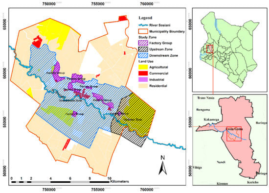 The survey was carried around River Sosiani, located in Eldoret town, which serves as the Uasin Gishu County’s capital in the Rift Valley region of Kenya. River Sosiani is a sub-catchment of the River Nzoia, which is a sub-basin that drains into Lake Victoria [69]. Lake Victoria is largest freshwater lake in East Africa, shared among three countries, i.e., Tanzania, Uganda and Kenya. It supports a huge population of communities that live near the lake. Eldoret is of strategic importance in the country, as it is the junction connecting main highways heading to the three East African countries, namely Kenya, Uganda and Tanzania. The land in Eldoret rises from the Sosiani River Valley, with its basin covering approximately 647 km2 of area [70]. The main activities within the River Sosiani catchment involve farming in the upper zone, comprising both small-scale mixed farming and a few large-scale farmers growing wheat, maize and flower farming [70]. The midstream zone consists of human settlements, industries and hospitals, and the downstream zone is an urban environment marred by large road networks, garages and car washes as well as other industries. Besides the rapid population growth, industrial activities in the region have also increased over the years, characterized by consumer goods, with the primary goods being machinery and transportation equipment, textiles, petroleum products, iron and steel [71]. The rapid population growth in the basin and subsequent growth of urban areas to accommodate the large population have contributed to uncontrolled land use practices, reclamation of wetlands and deforestation of the upper catchment areas of the town [70]. Rapid industrial development coupled with unsustainable environmental practices, such as industrial and agricultural discharge in the river, poor agricultural practices and poor waste management in the region, have led to decreased water quality in river Sosiani over the years. This has left the government of Kenya with the burden of restoring the river. The residents lack clean water and experience water shortages [72]. Another major challenge has been large outbreaks of diseases, such as cholera and typhoid, which are often associated with poor and unsanitary water practices in the area [73].