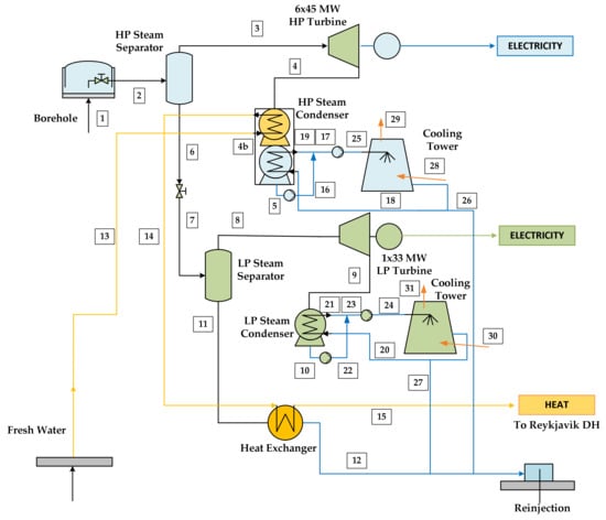 The geothermal plant of Hellisheiði is a double-flash unit [21,22] that allows the production of electricity (303 MWe) and hot water (133 MWt). One of the main issues of geothermal power plants is the emissions of both carbon dioxide (CO2) and hydrogen sulphide (H2S). The present study takes into account two scenarios: a baseline (scenario 1) [5] and an upgraded (scenario 2) [23], which includes carbon sequestration and acid gas removal (CARBFIX Project).