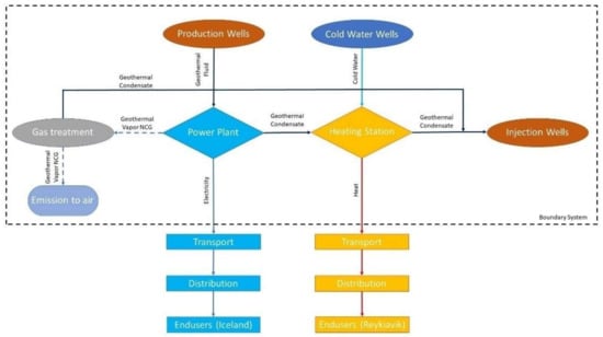 A flowchart of the Hellisheiði geothermal system is presented in Figure 2. The Hellisheiði geothermal plant has two separate products: electricity and hot water. In this work, the exergy approach was chosen and all processes were allocated to exergy, instead of considering electricity and heat separately. The functional unit is thus 1 MWh of exergy; the lifetime of the plant was set to 30 years of operation (this time is chosen for comparability with other datasets and it is a typical lifetime applied for geothermal plants). The total exergy produced in the powerplant is composed of work and heat exergy contributions. The work output corresponds to the electricity produced by the turbines (a capacity factor = 0.87 was assumed [5]). The heat exergy was calculated taking into account both the quantity of heat produced (the average heat production is 91.44 MWt [5]) and its quality, which depends on the temperature at which it is available. Specifically, the heat exergy was evaluated applying a Carnot factor conversion, based on the log-mean temperature of the primary district heating loop (40–90 °C) and the average annual ambient temperature for Iceland (5 °C).