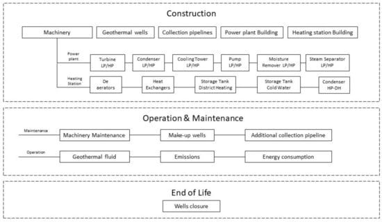 The Life Cycle Inventory (LCI) was developed using both primary and secondary data. Primary data (input and output flows) for the main processes in the foreground system referring to the power plant construction and operation, that is, input materials flow at the construction of the wells, structures, machinery, and pipelines as well as those used in operation and maintenance phases and transportation stages were gathered from the various scientific publications relating to this plant [5,6,23,25,26]. Similarly, data regarding the energy consumption that is: consumption of diesel for wells drilling, internal use of electricity at the site and for drilling wells, and the composition of geothermal fluid represent primary data. Secondary data such as inventory for electricity or construction material production were retrieved from the Ecoinvent database version 3.6. For consistency, average EU mixes regarding materials and other resources were considered. In Figure 3 the considered life cycle phases are specified. The construction process considers heating station building, power plant building, geothermal wells, collection pipelines, and machinery. The maintenance process considers the need for an additional structure such as wells and pipelines to sustain production during the plant’s lifetime. Also, the mass flow of elements used in the cooling tower maintenance is considered. The operation process considers the use of geothermal fluid, gas emission to air, and the additional use of electricity used for the cold water pump in the heating station building.