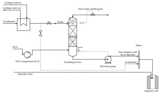 The atmospheric pressure gas stream (0.336 m3/s) is washed by a flow rate of 36 kg/s of freshwater, taken from the bottom of the column, and sprayed at 6 bar and 20 °C. A relevant fraction of the gases is dissolved in the output water stream directed to reinjection, while the non-water-soluble gases are vented to the atmosphere. Non-Condensable Gases (NCG) gas compressor and Pump recovery data design are reported in Table 3.