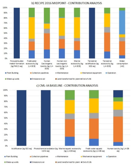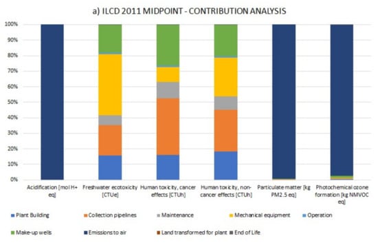 The normalization process applied in Table 5, Table 6 and Table 7 allows highlighting the most relevant categories for the midpoint analysis. In general, emissions to air produce a relevant impact regarding Acidification, Particulate Matter, Photochemical Ozone Formation, Human toxicity, and Freshwater ecotoxicity. The reduction of these impacts is an important objective to be achieved, which led to the introduction of the gaseous effluent treatment system on this plant. Each of the methods evaluates the impacts in different ways but it can be observed that all of them identify similar major environmental effects. Figure 5a–c shows the contribution analysis, which demonstrates that most of the impacts come from the construction of wells, pipelines, and mechanical equipment. It can be observed that power plant maintenance has a relatively low environmental impact, while the end of life almost is nearly negligible compared to the total.