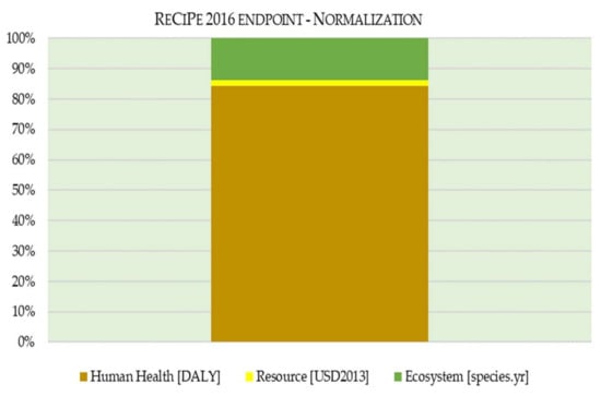 The ReCiPe method [30] includes provision for the further step of Damage Assessment (EndPoint LCIA): all the Midpoint impact categories are reduced to three major damage macro-categories: Human health (DALY), Ecosystem quality (species × yr), and Resource depletion (USD2013). The results are 1.72 × 10−3 DALY, 2.47 × 10−6 species × yr, and 2.41 × 10−1 USD2013 respectively (all these values are referred to the functional unit, MWh of exergy). After normalization, it is clear that Recipe indicates that Human Health is the most impactful damage category concerning the total impact, covering about 84.4% of the total (Figure 6).