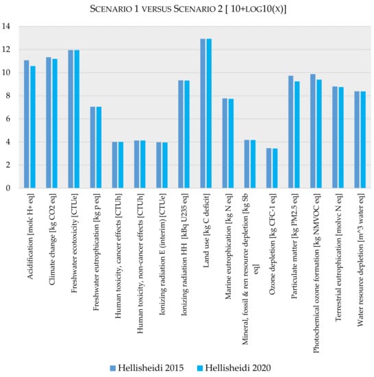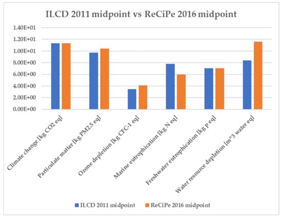 It can be noted from Figure 7 that the Climate Change and Freshwater Eutrophication categories are very close for both methods. The Particulate Matter category differs but the calculation method applied is similar. The Ozone Depletion, Marine Eutrophication and Water Resource Depletion categories differ widely and the last one is an example of the relevant difference in approach between the two methods: in fact, the overall assessed water consumption is 2.40 × 10−2 m3 for ILCD 2011, while it is 3.91 × 101 m3 for ReCiPe 2016. Moreover, after normalization this is a negligible category for ILCD, covering about 0.08% of the total impact; for ReCiPe, instead, it is a relevant category and covers about 11.62% of the total impact. This fact occurs because ILCD uses a country-specific factor, which is reflected on the characterization factor, based on scarcity classification (Iceland is a country with a low scarcity of water: Water Scarcity ratio ≤0.1), instead, ReCiPe considers a characterization factor of 1 m3 of water consumed per m3 of water extracted [32,33].