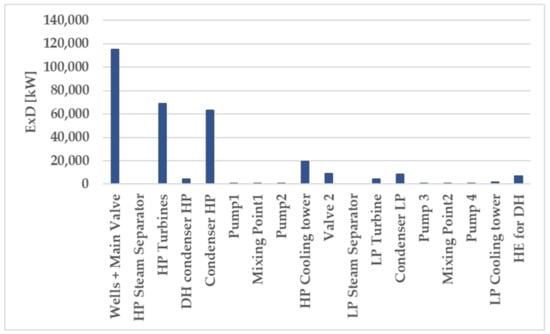 The components which have the highest potential for improvement are those with a high value of : in this case, the HP turbines, the DH condenser, and the HP Condenser. Indeed, there is room for improvement in these components, as testified by the high exergy destruction values. On the other hand, the Wells and main valve present a low value of , this means that to improve this component, a more difficult intervention should be carried out.