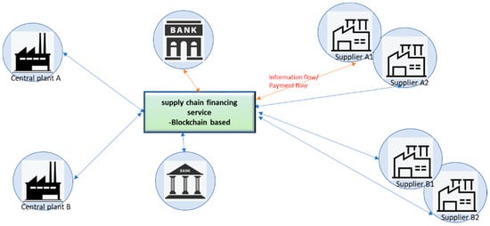In the past, intermediary banks financed suppliers, and this function is now performed by blockchain financing platforms. With such platforms, various information transferred between the central plant and its suppliers, such as that related to production, manufacturing, and orders, is uploaded. In addition, the data encryption method prevents the information of one central plant from being arbitrarily revealed to other central plants. Mutual authentication of information flow and payment flow can effectively meet needs regarding capital and the supply chain. Figure 9 illustrates how blockchain-based platforms make information transparent and simplifies the cost of intermediary communication.