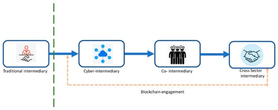 Figure 11 illustrates that blockchain technology empowers stakeholders to reverse traditional processes in data management, but cannot be fully substituted for legacy systems. Therefore, semi-intermediary coupling with cyber-intermediary facilitates business transactions and gradually transforms operation processes.