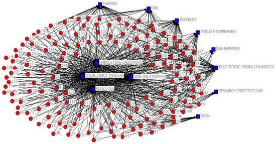 Development of farmers’ clusters has been argued to enhance connections with diversified actors and strengthen innovation [76,79,80]. This study found that clustering leads to DAE-farmers connect with limited actors [81]. Due to developing clusters with formal actors, DAE-farmers did not extensively look for other actors beyond the clusters to secure information and support in the agronomic networks. As a result, they missed important information and new ideas from the potential informal actors, such as local input dealers, relatives, and harvesting laborers. However, like non-DAE farmers, a significant portion of farmers in Bangladesh obtain agricultural information from local input dealers [96]. In addition, informal actors such as neighbors, relatives, and friends play an important role in providing farming information and resources to the rice farmers in Bangladesh [96].