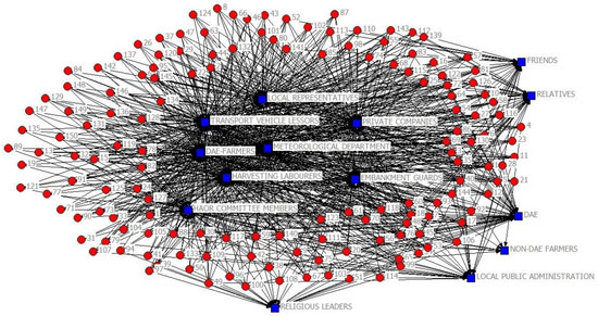 Innovation networks of non-DAE farmers for harvesting activities (red circle = non-DAE farmer, blue square= connected actor).
