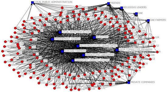 DAE- and non-DAE farmers had connections with formal public sector actors, such as DAE, the meteorological department, and the local public administration; and private sector actors, such as private companies. They were also connected with informal actors, such as DAE- and non-DAE farmers, relatives, friends, harvesting laborers, embankment guards, and transport vehicle lessors; and local elites, such as Haor committee members, local representatives, and religious leaders (see Figure 3 and Figure 4). A large percentage of both DAE- and non-DAE farmers developed clusters with informal, local, and elite actors, such as embankment guards, transport vehicle lessors, harvesting laborers, local representatives, and Haor committee members. DAE was excluded in the DAE-farmers’ clusters and is located at the periphery of the map.