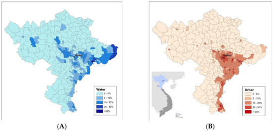 Share of water (panel A) and share of urban areas (panel B) in districts in northern Vietnam.