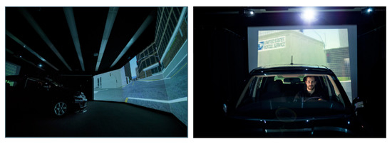 Participants rode a programmed AV in a simulated environment with a high-fidelity advanced driving simulator (Figure 2). The simulator consisted of a Nissan Versa sedan providing all manual controls and a simulation system running with programmable software (version 2.63 of Realtime Technology’s RTI). Four projectors displayed the visual environment to participants on four flat walls. The forward road scenes were projected on three walls about 16 feet in front of the driver (120-degree field of view), and the rear view was shown on a rear wall located 12 feet from the steering (40-degree field of view). Each forward screen was set at a resolution of 1400 × 1050 pixels and updated at 60 Hz, and the rear screen was set at a resolution of 1024 × 768 pixels.