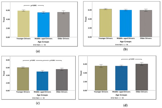 For the no-AV-explanation condition, results showed that trust for middle-aged drivers (μMid-age = 5.49) was significantly lower than trust for the younger drivers (μYounger = 5.88). However, no difference was found between middle-aged and older drivers (μOlder = 5.54), as well as between younger and older drivers (p > 0.05). Table 5 provides the means and standard deviations for each condition. The means and their corresponding significant p values are depicted in Figure 3a.