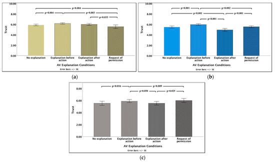 For older drivers, trust was significantly lower (p < 0.05) in the no-AV-explanation (μNExpl = 5.54) and AV-explanation-after-action (μAExpl = 5.54) conditions than in the AV-explanation-before-action (μBExpl = 5.91) and request-for-permission (μPermReq = 6.00) conditions. However, no difference in trust was found between the AV-explanation-before-action and request-for-permission conditions (p > 0.05), and no difference was found between the no-AV-explanation and AV-explanation-after-action conditions (p > 0.05). Table 5 provides the means and standard deviations for each condition. Figure 4c visually depicts the means and their corresponding significant p values.