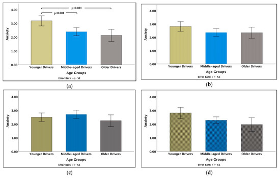 The average anxiety under four different conditions by age group: (a) younger drivers; (b) middle-aged drivers; and (c) older drivers.