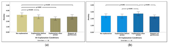 For younger drivers, anxiety was significantly higher (p < 0.05) in the no-AV-explanation condition (μNExpl = 3.18) than in the AV-explanation-before-action (μBExpl = 2.81), AV-explanation-after-action (μAExpl = 2.50), and request-for-permission (μPermReq = 2.81) conditions. However, there were no differences in anxiety among the AV-explanation-before-action, AV-explanation-after-action, and request-for-permission conditions (p > 0.05). Table 7 provides the means and standard deviations for each condition. Figure 6a visually depicts the means and their corresponding significant p values.