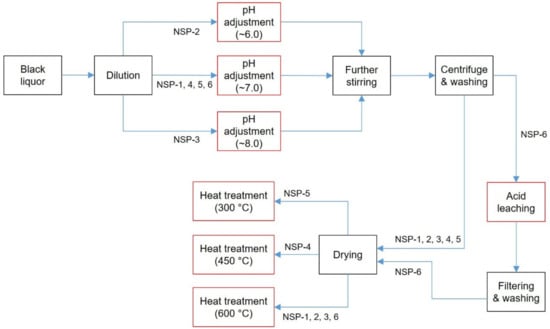 Nano-structured silica powders (NSP series) were obtained from a black liquor. A block diagram according to the preparing sequence and conditions is shown in Figure 1. In a typical preparation of NSP-1, 450 mL of the black liquor diluted with 50 mL of distilled water was used. First, the pH of the black liquor was adjusted to ~7.0 by addition of acetic acid. After the resulting solution was stirred for 12 h at room temperature (~25 °C), it was centrifuged at 5000 rpm for 5 min; the supernatant was then decanted away. The remaining products were washed several times with distilled water and dried overnight at 80 °C. Finally, the dried powders were heat-treated at 600 °C for 2 h under air atmosphere. Through this process, we obtained ~15.5 g of silica powders per liter of black liquor. The overall synthesis procedure of NSP-2 and NSP-3 was similar to that of NSP-1, except that the pH of the black liquor was adjusted to ~6.0 and ~8.0, respectively.