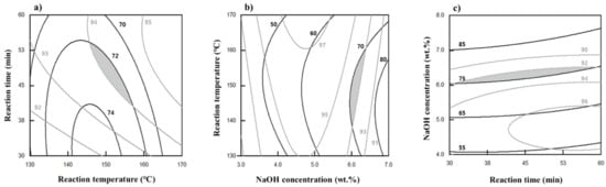 Figure 2 attempts to represent the change of dependent variables by overlaid contour lines for the interactions between the independent variables; therefore, the gray-toned contours represent the changes in the de-ashing yield, and the black-toned contours were expressed for the changes in the hemicellulosic sugar extraction yield. Since a relatively high de-ashing yield was obtained in most of the experimental range, the optimization criterion was given priority to the range in which the hemicellulosic sugar extraction yield could be obtained more than 70%. It was determined that the de-ashing yield was high, and the overlapping portion appeared to be suitable for the purpose of the processing, which was indicated in grayscale. Figure 2a shows that over 72% hemicellulosic sugar extraction yield and 94% de-ashing yield can be obtained in the range of reaction temperature of about 146 to 158 °C and reaction time of about 41 to 55 min. Likewise, in the case of reaction temperature, there was a possibility to obtain an hemicellulosic sugar extraction yield of 70% or more and a de-ashing yield of 93% or more in a wide range of about 140 to 160 °C, but the NaOH concentration to meet these yields was determined to be possible only in a narrow experimental range of about 5.8–6.3% (Figure 2b).