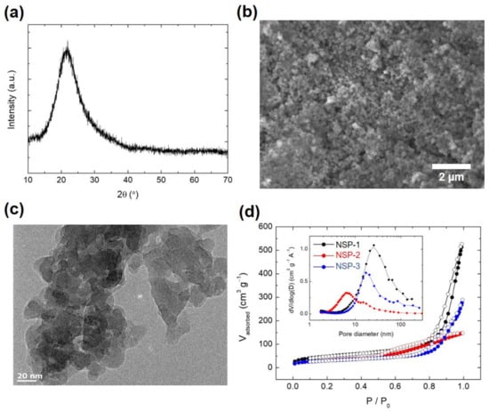 To prepare an initial test sample (NSP-1), the pH of black liquor was adjusted to approximately 7.0 using acetic acid, followed by heat treatment at a high temperature (600 °C) to completely remove the organic components. The XRD pattern of NSP-1 exhibited a broad diffraction near 20°, which is typical for amorphous silica (Figure 3a). It was seen that silica content among the inorganic components of NSP-1 was as high as 98.0%, and a small amount (1.76%) of sodium compound was also measured. SEM and TEM images of NSP-1 showed that the small nano-particles aggregated into large particles with sizes of a few hundred nanometers (Figure 3b,c). These types of hierarchical nano-structures impart NSP-1 with a large surface area of 175 m2 g−1 and a pore volume of 0.81 cm3 g−1 (Table 3).