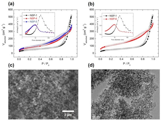 (a) N2 physisorption isotherms and pore size distributions (inset) of NSP-1, NSP-4, and NSP-5. (b) N2 physisorption isotherms and pore size distributions (inset) of NSP-1 and NSP-6. (c) SEM and (d) TEM images of NSP-6.