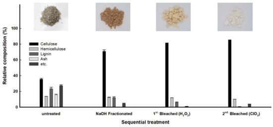 In addition, figures of residual solids for each sequential bleaching were intended to be shown at the top of Figure 5. After the second-stage bleaching process, the residual solid had a white color, which was believed to be due to the removal of lignin and other impurities as the bleaching proceeds sequentially. The change in the colors of the residual solids in each sequence well explained the change in the chemical composition as the bleaching progresses.