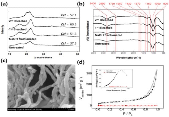 (a) XRD patterns, (b) FT-IR patterns, (c) SEM image of CNF, (d) N2 physisorption isotherms and pore size distributions (inset) of NaOH + bleaching treated RH, CNF.