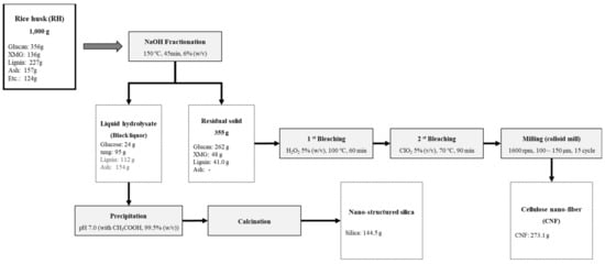 The parameters of the alkaline fractionation process were investigated and optimized using a statistical analysis method to simultaneously remove hemicellulose and ash from rice husk (RH) concomitantly. After the alkaline fractionation process, the residual solid contained high cellulose, and the recovery yield of hemicellulose was enhanced in the fractionated liquid hydrolyzate. The hemicellulosic sugar recovery yield (71.6%), de-ashing yield (>99%), and lignin removal (>80%) were obtained at the reaction conditions of 150 °C of temperature, 40 min of reaction time, and 6% (w/v) of NaOH concentration. Subsequently, nano-structured silica was synthesized using black liquor obtained as a by-product of this fractionation process. For the production of nano-structured silica, it was observed that the pH of a black liquor and the heat treatment temperature significantly influenced the textural properties of silica product. In addition, the two-stage bleaching of solid residue followed by colloid milling for the production of high value-added CNF with was attempted. As a result, in addition to 119 g of fermentable sugar, 143 g of high-purity (>98%) silica with a surface area of 328 m2g−1 and 273.1 g of high-functional CNF with cellulose content of 80.1% were simultaneously obtained from 1000 g of RH.